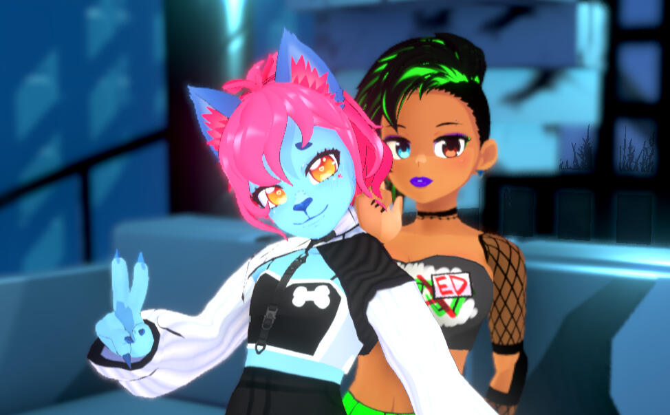 CHERRI is my OC/Mascot!She's the girl with pink hair and heart-shaped buns. In-lore, she's my impromptu-roommate!